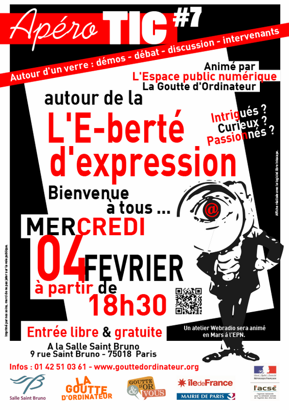 L’Espace public numérique « La Goutte d’Ordinateur » continue d’animer le débat autour du rôle des TIC dans la vie quotidienne, sociale et citoyenne, en lançant son septième ApéroTIC le Mercredi 04 Février 2015 autour de la l’E-Berté d’Expression.