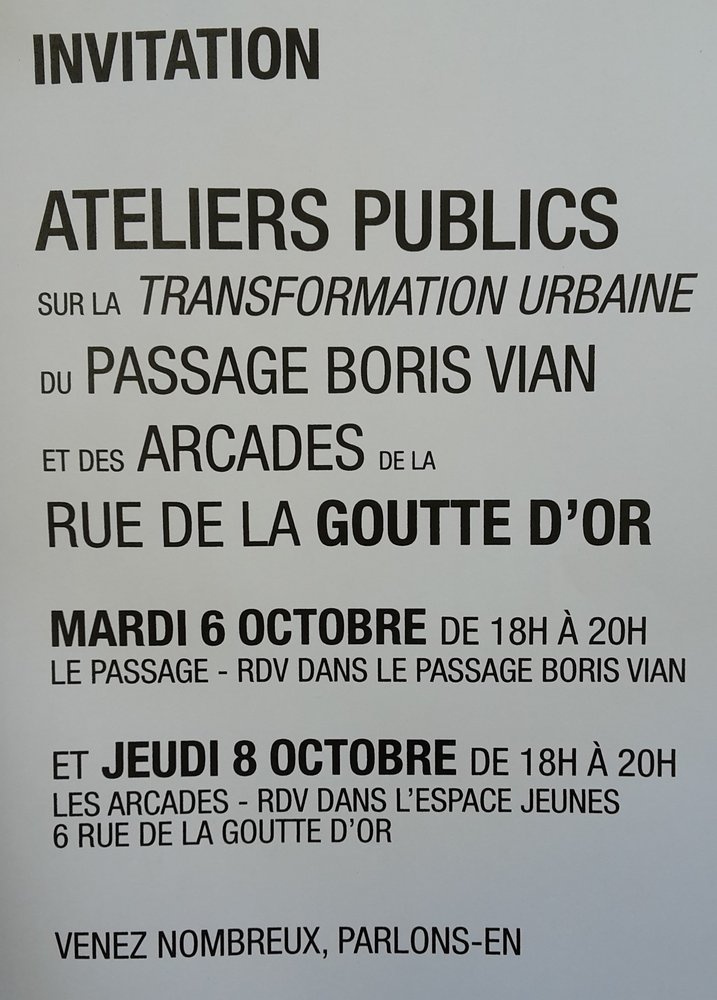 Une réflexion est actuellement menée pour le réaménagement du secteur des arcades de la rue de la Goutte d’Or et du passage Boris Vian. Le cabinet d’architectes FERARU a été désigné par la Direction de l’Urbanisme de la Ville de Paris pour mener le projet, mais souhaite consulter les habitants, les usagers, les services de la Ville et l’équipe d’urbanistes, afin de répondre aux besoins de chacun.