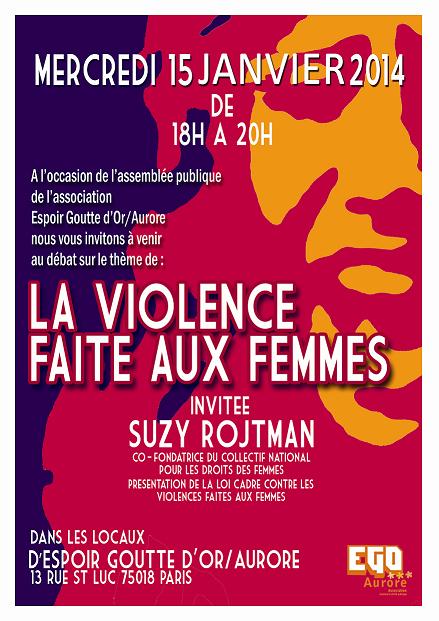 Mercredi 15 janvier 2014 - 18H/20H dans les locaux d’EGO/Aurore, 13 rue Saint Luc. Présentation de la loi-cadre contre les violences faites aux femmes par Suzy Rojtman, co-fondatrice du collectif national pour les droits des femmes.