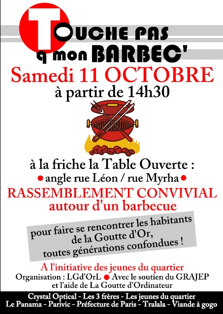 Des jeunes du quartier, organisés par l’association LGd’OrL, avec l’appui du GRAJEP, invitent les habitants de la Goutte d’Or, toutes générations confondues, à se rencontrer autour d’un barbecue samedi 11 octobre, à partir de 14h30, sur la friche de la Table Ouverte, angle des rues Léon et Myrha.