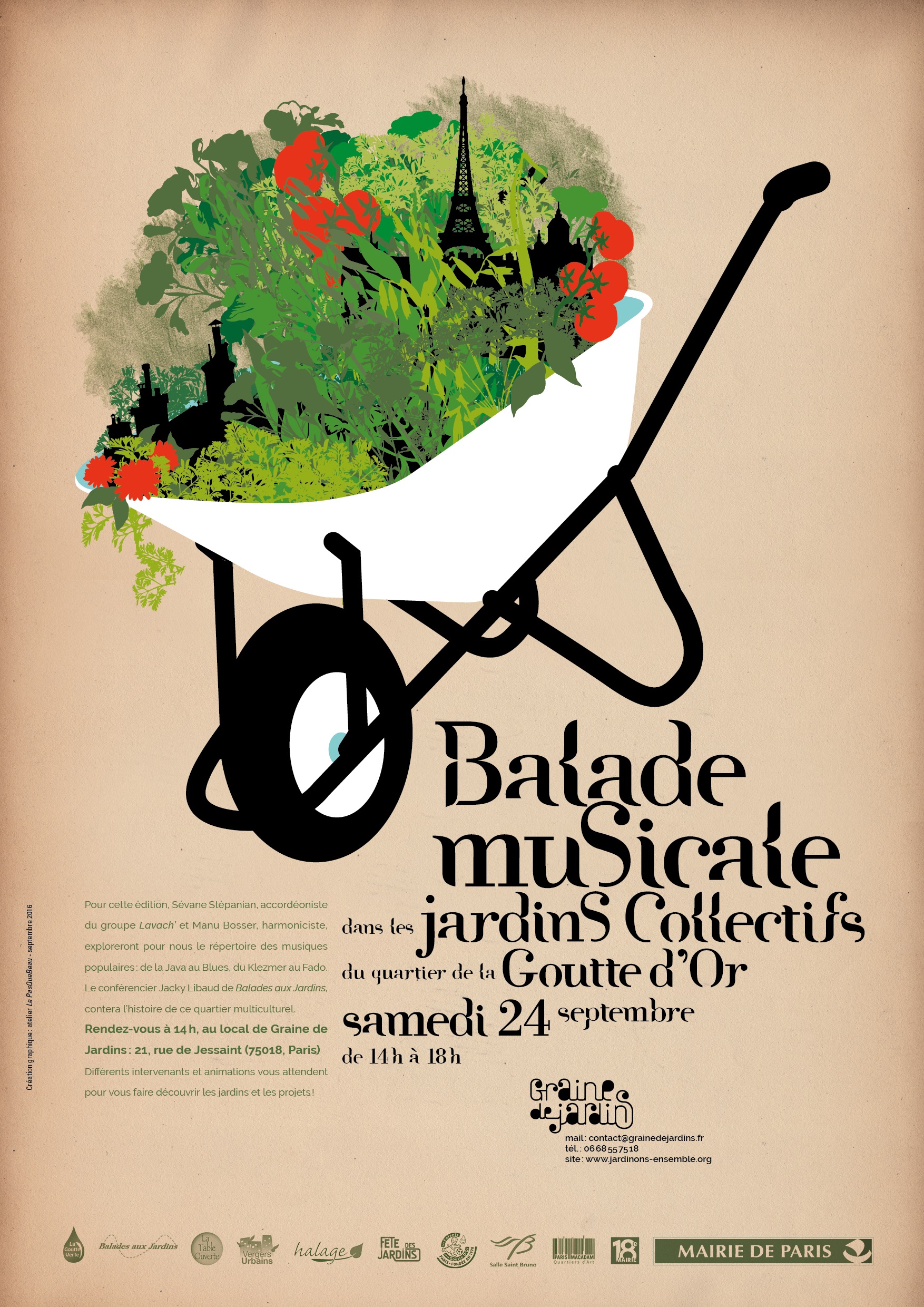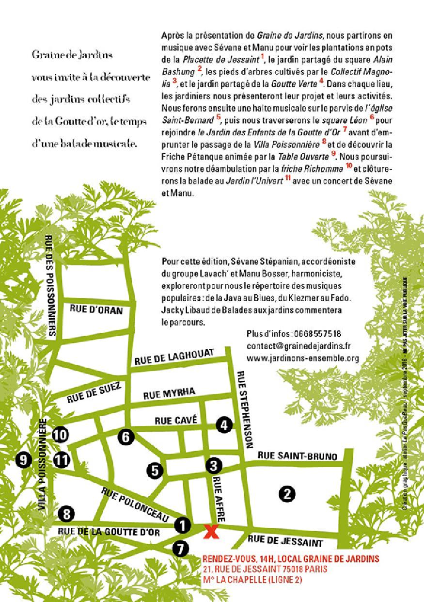 Départ dès 14h à partir du local de Graine de jardins pour une balade musicale de jardins en jardins à la Goutte d’Or, dans le cadre de la fête des jardins, et présentation des dispositifs de la ville pour végétaliser et aménager les espaces publics du quartier.