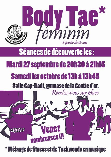 Mardi 27 septembre de 20h30 à 21h15 et samedi 1er octobre de 13h à 13h45, venez découvrir gratuitement le Body Tae féminin, un mélange de fitness et de taekwendo. Et si vous connaissez déjà, venez vous inscrire auprès des Enfants de la Goutte D’Or.