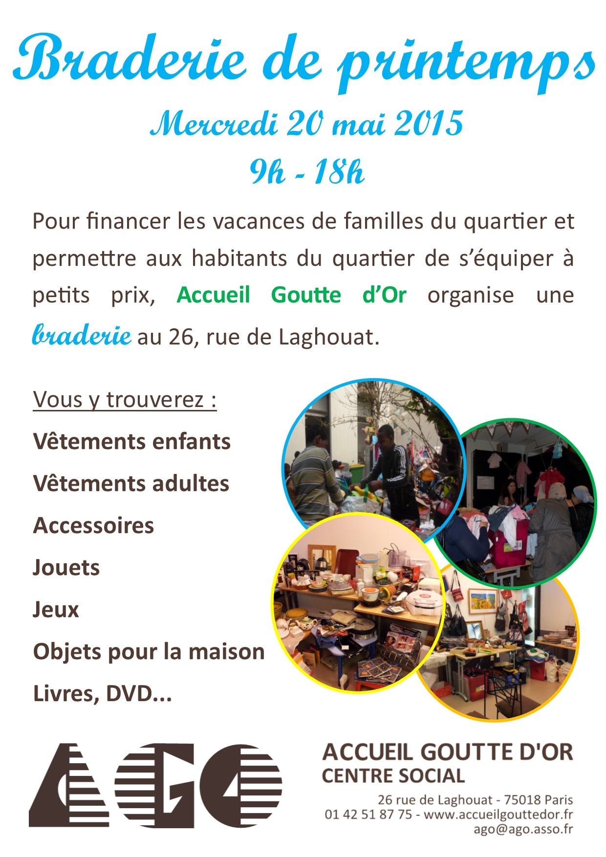 Pour financer les vacances de familles et permettre aux habitants du quartier de s'équiper à petits prix, Accueil Goutte d'Or organise une braderie le mercredi 20 mai 2015.