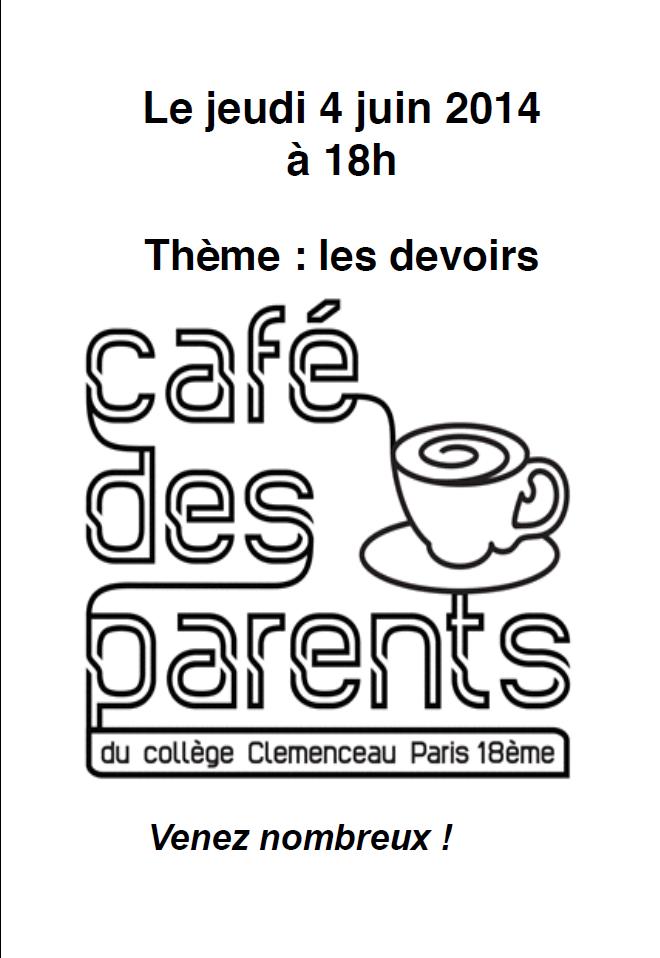 Tous les parents des élèves du collège Clemenceau sont invités à participer au prochain café des Parents, jeudi 4 juin 2015 à partir de 18h. Sur le thème : "les devoirs"Venez nombreux !