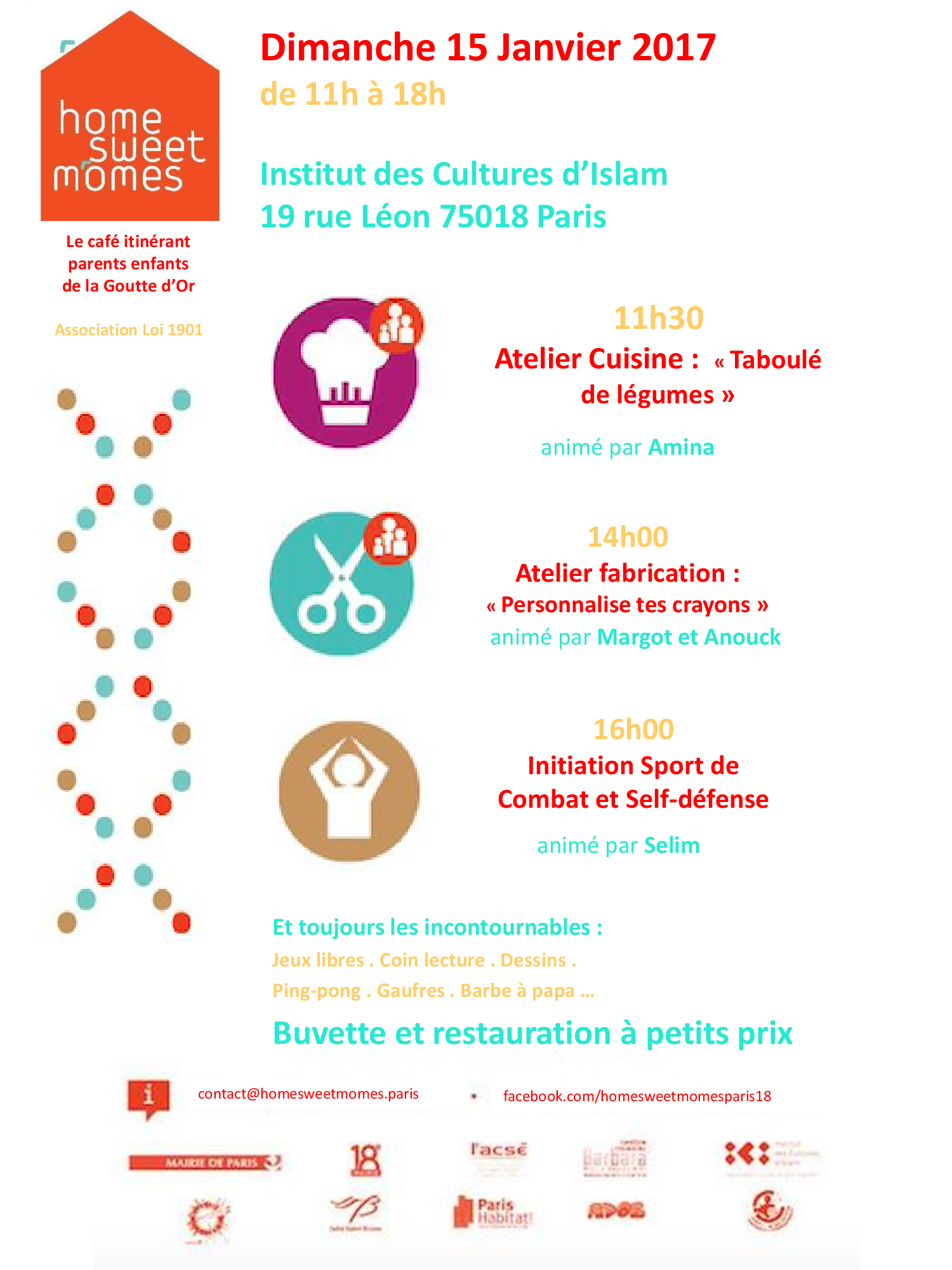 De 11h à 18h, venez vous rencontrer et vous amuser avec le café itinérant parents enfants Home Sweet Mômes, ce dimanche à l’Institut des Cultures d’Islam.