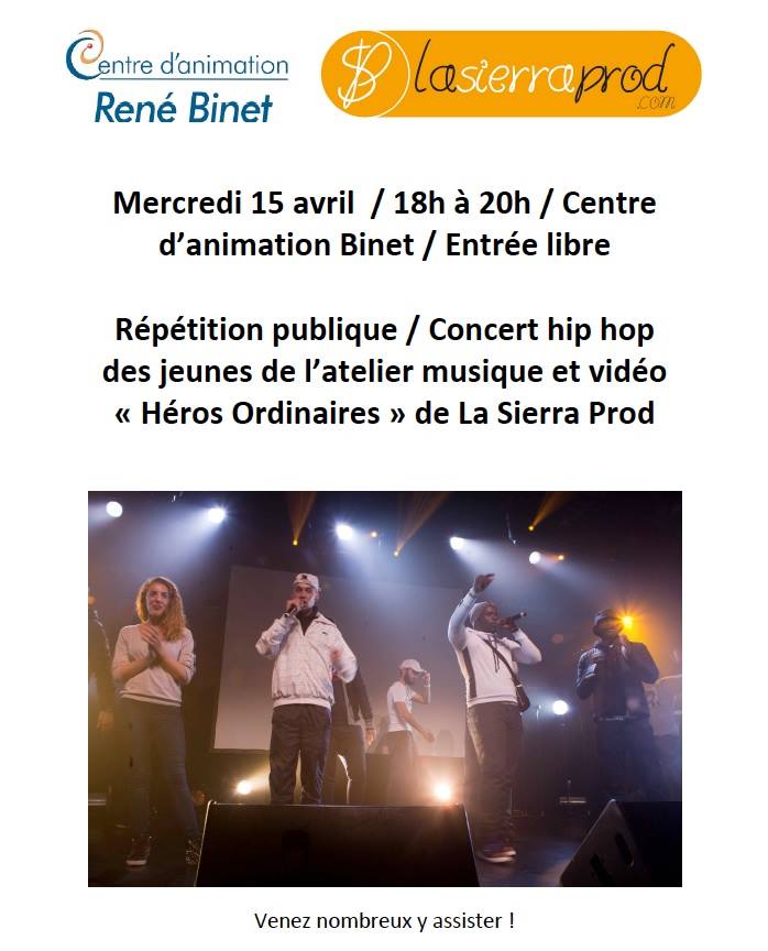 La Sierra Prod organise une répétition publique de "Héros Ordinaires", leur atelier musique et vidéo, le 15 avril au centre d’animation Binet (avenue de la Porte Montmartre). L’occasion de venir échanger avec les jeunes sur leur prestation (concert hip hop et Vjing) ! La restitution annuelle de tous nos ateliers musique et vidéo aura elle lieu le samedi 23 mai au Centre musical FGOBarbara.