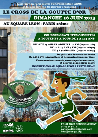 Les associations Paris Goutte d’Or et ADOS vous invitent à participer au Cross de la Goutte d’Or le 16 Juin à 10 heures. L’année dernière, il a réuni plus de 200 participants... record à battre ! Plus d’informations prochainement concernant le lieu de départ.