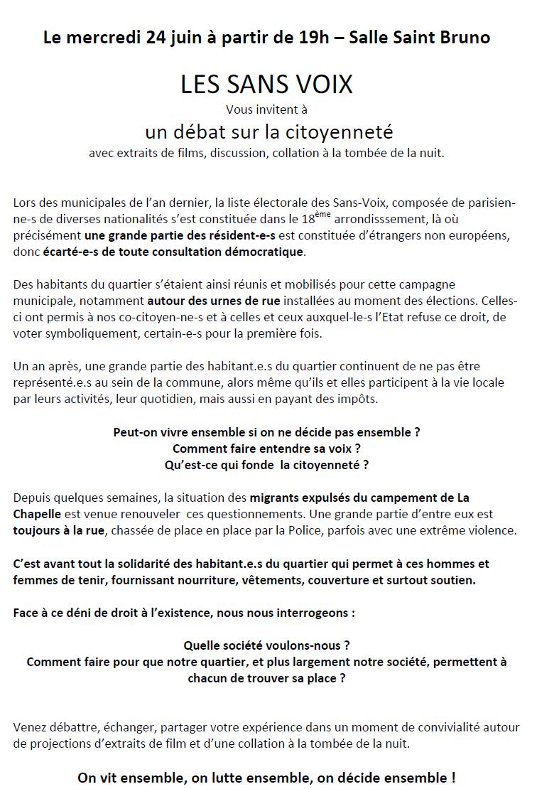 Organisé par le Collectif "Sans Voix" à la Salle Saint Bruno, 9 rue St-Bruno, à 19h.
