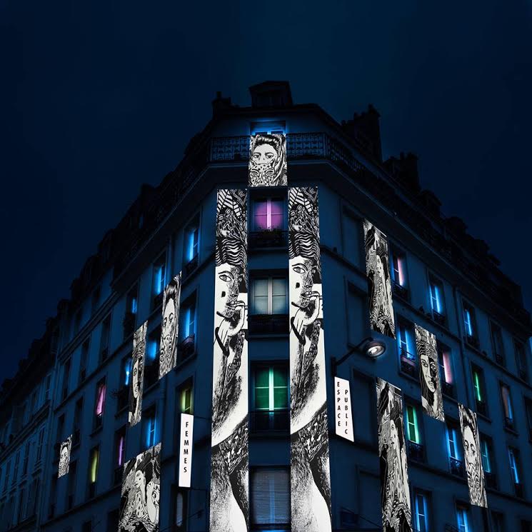 FAÇADES est l’occasion pour l’artiste d’exposer et de mettre en lumière ses "déesses du bitume" comme elle les appelle, des portraits grand format de femmes puissantes et affirmées, sur des façades et espaces publics du quartier. Ainsi les femmes se réapproprient la rue et se rendent visibles aux yeux de toutes et de tous le temps de plusieurs nuits qui leur sont dédiées.