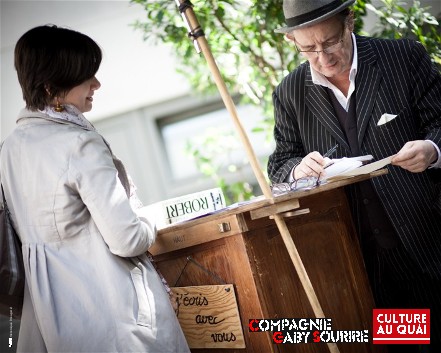 La COMPAGNIE GABY SOURIRE sera présente à l’évènement CULTURE AU QUAI le week-end du 26 et 27 septembre 2015 de 14h à 19h Quai de Loire - M°Jaurés avec l’intervention de rue : ÉCRIVAINS TOUT PUBLIC www.cultureauquai.com