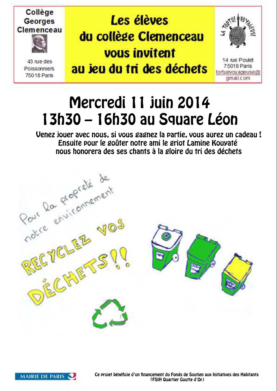 Les élèves du collège Clémenceau et la Tortue Voyageuse vous invitent au Jeu du tri des déchets, mercredi 11 juin 13h30-16H30 au square Léon. Cadeaux pour les gagnants, goûter-concert du griot Lamine Kouyate.