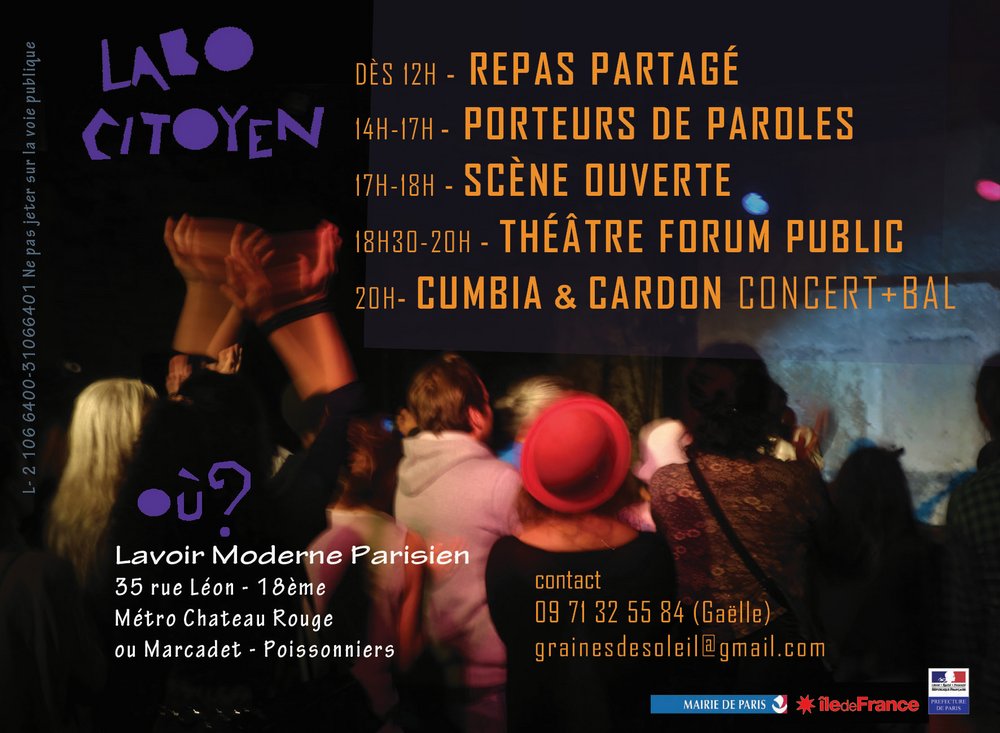 18h30-20h : Théâtre Forum Public, qui sera l’occasion de débattre autrement à partir des saynètes qui vous seront présentées et qui ont interrogé l’espace public.