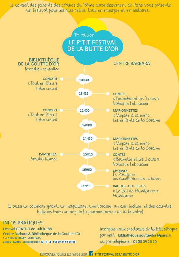 Le Conseil de parents* du 18e arrondissement vous convie au P’tit Festival de la Butte d’Or, le samedi 21 mai de 10h à 18h ! Le centre FGO-Barbara et la bibliothèque de la Goutte d’Or nous font l’honneur d’accueillir cette première édition !