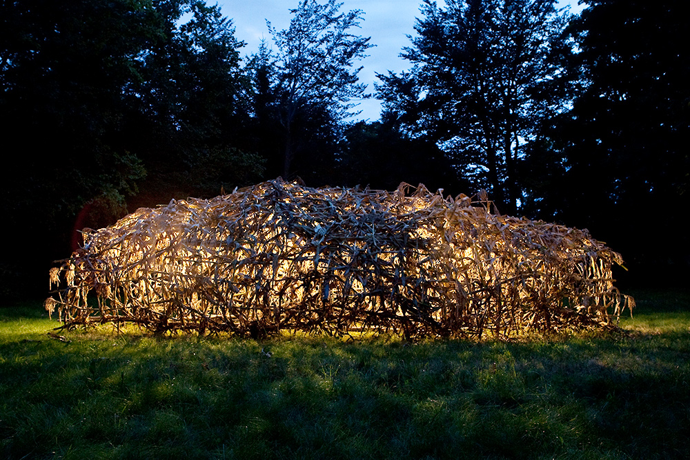 La construction du squelette du cocoon se fait à partir d’éléments récupérés tels que du bois, des éléments végétaux, des matériaux souples, des objets recyclables...