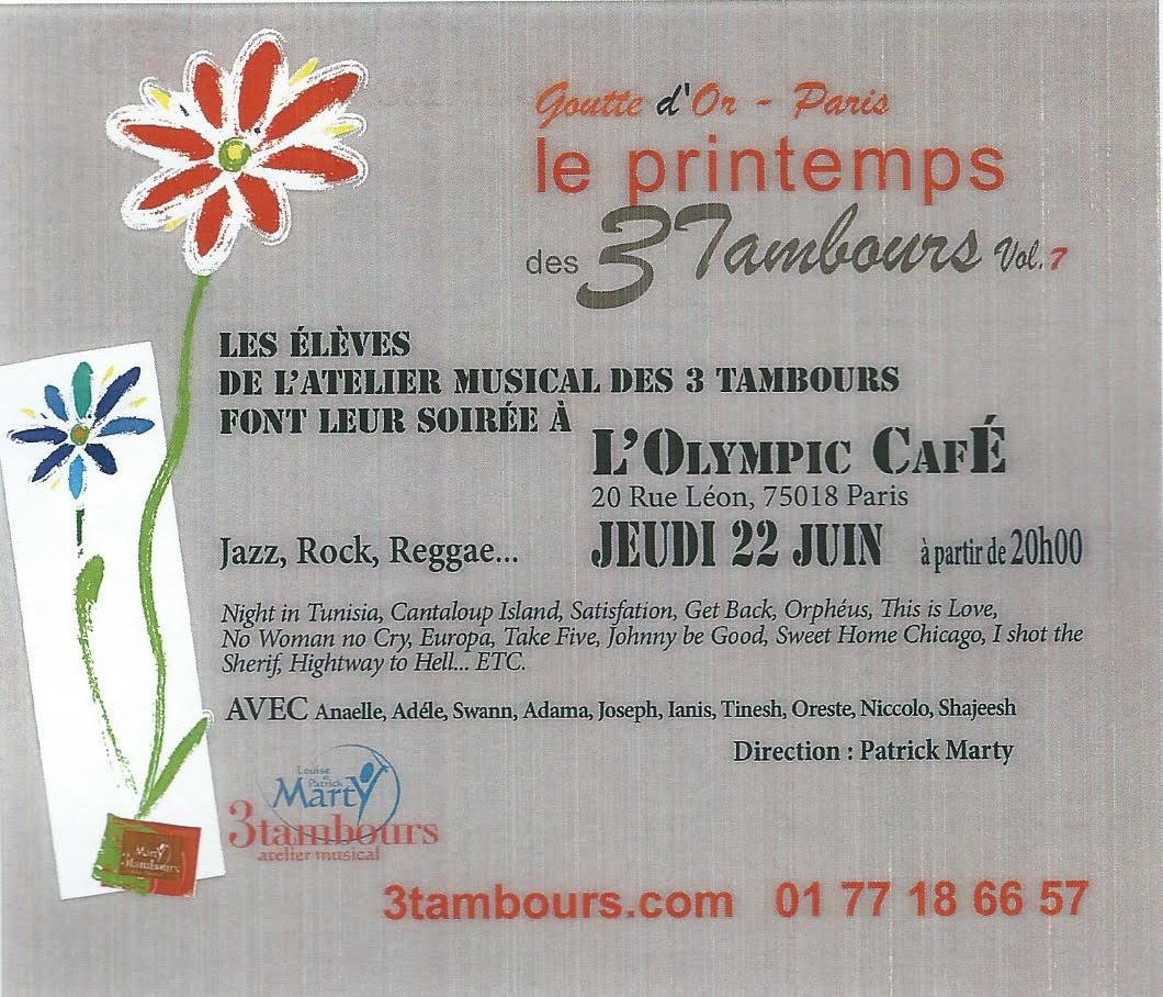 Jeudi 22 juin, à partir de 20h, rendez-vous à l’Olympic Café pour une soirée organisée par l’atelier musical les 3 Tambours.