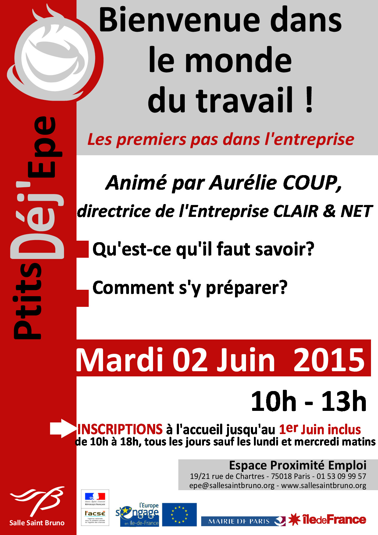 L’Espace Proximité Emploi vous propose un nouveau P’tit Déj’ "Bienvenue dans le monde du travail" Mardi 02 juin 2015 de 10h00 à 13h00. Cet atelier est destiné à vos publics et sera animé par Aurélie COUP, Directrice de l’Entreprise Clair & Net.