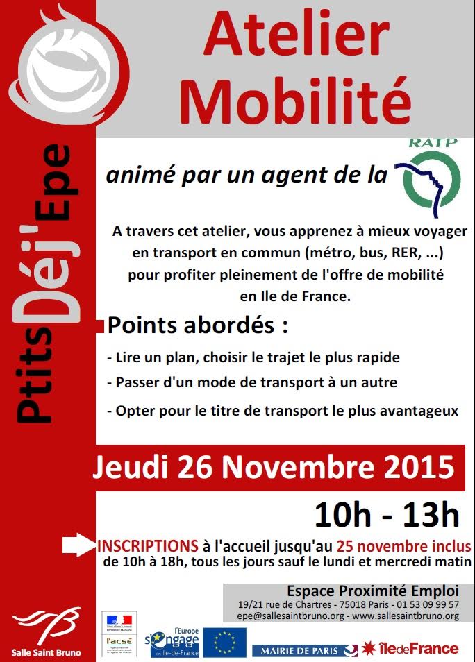 L’Espace Proximité Emploi vous propose ce mois-ci un Atelier mobilité en partenariat avec la RATP, le 26 novembre de 10h00 à 13h00.
