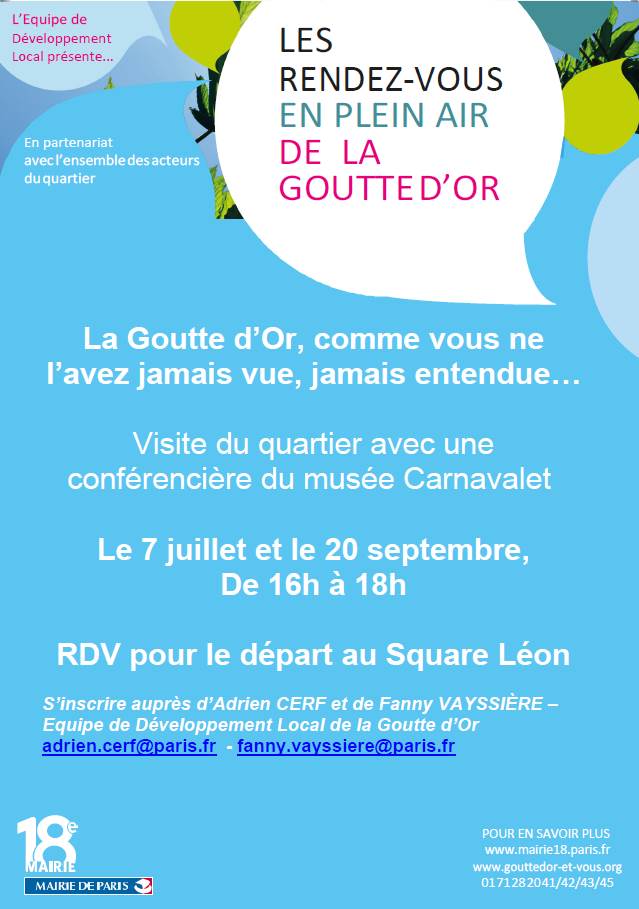 Le 7 juillet, visite de quartier animée par une conférencière du musée Carnavalet dans le cadre des "RDV en plein air de la Goutte d’Or". Seul ou en groupe, n’oubliez pas de vous inscrire pour participer.