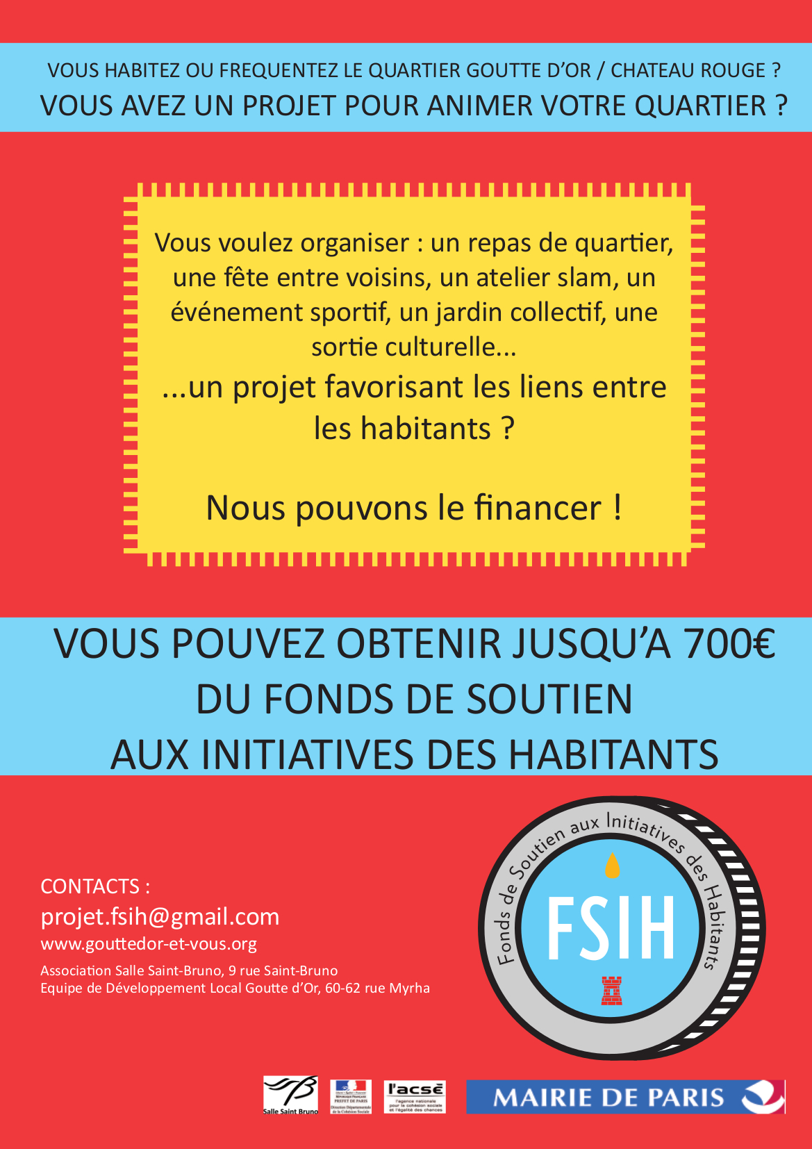 Le FSIH est porté par la Salle Saint Bruno (contactssb@sallesaintbruno.org / 01 53 09 99 22) qui co-anime le projet avec l’Equipe de Développement Local.