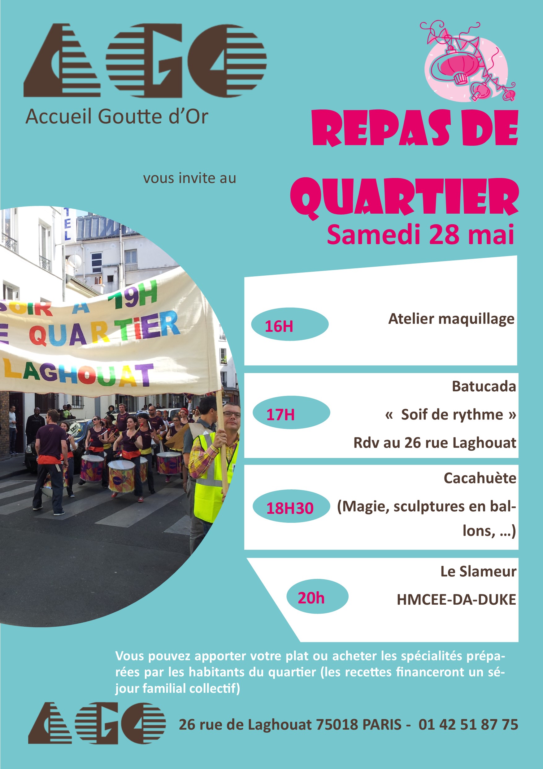 Le centre social Accueil Goutte d’Or est heureux de vous inviter à un moment de convivialité et de rencontres lors de son repas de quartier qui aura lieu le samedi 28 mai 2016.