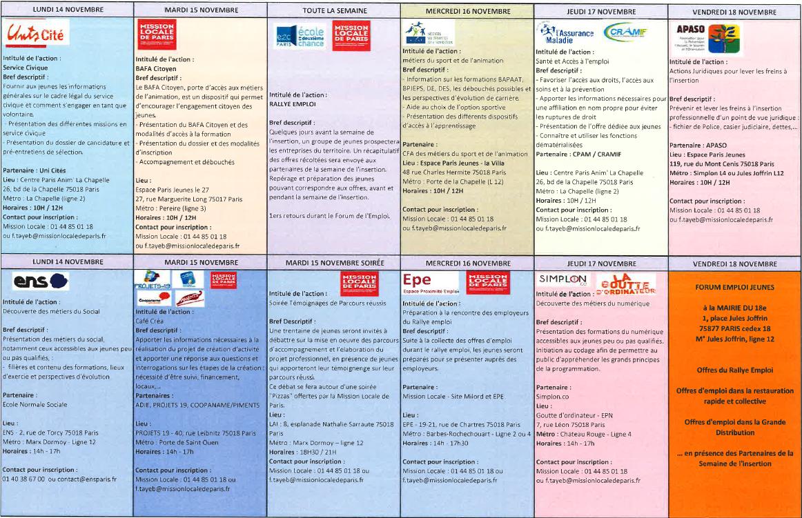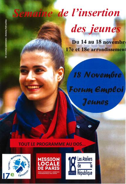 Du 14 au 18 novembre dans le 18e arrondissement, la Mission Locale et le réseau local organisent une semaine de l’insertion des jeunes qui passe par la Goutte d’Or, et se clôturera par un Forum pour l’emploi à la Mairie du 18.
