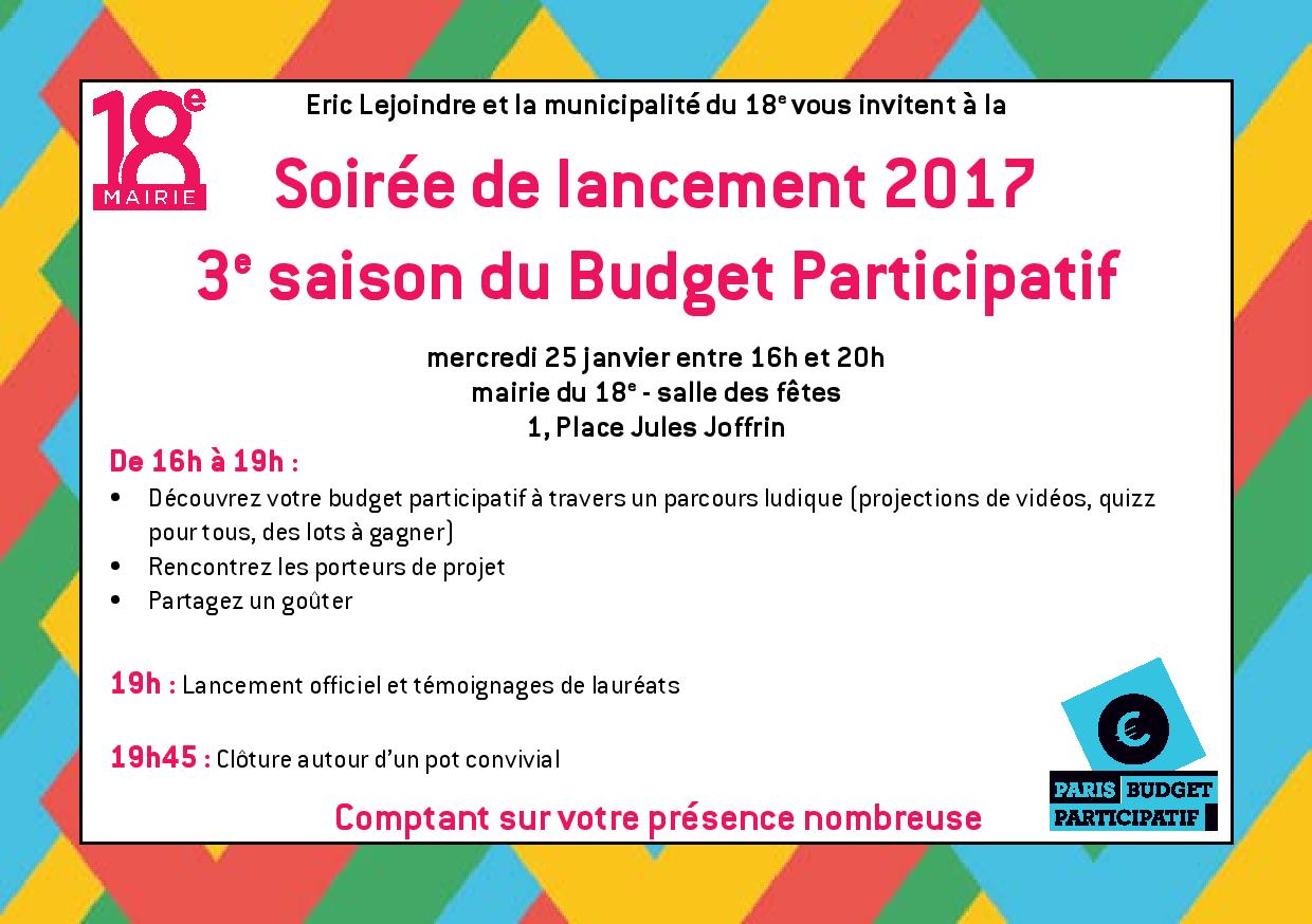 Soirée de lancement du Budget Participatif 2017 le Mercredi 25 janvier 2017 à 16h à la Mairie du 18ème.