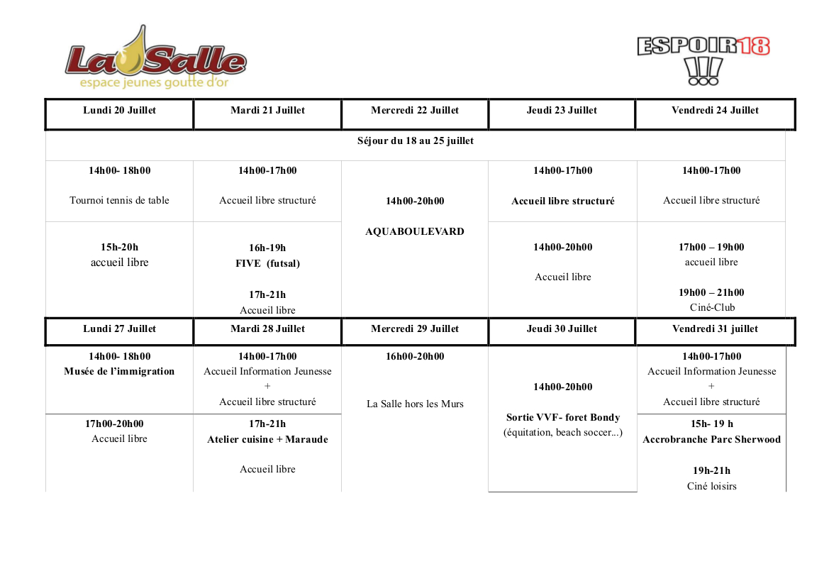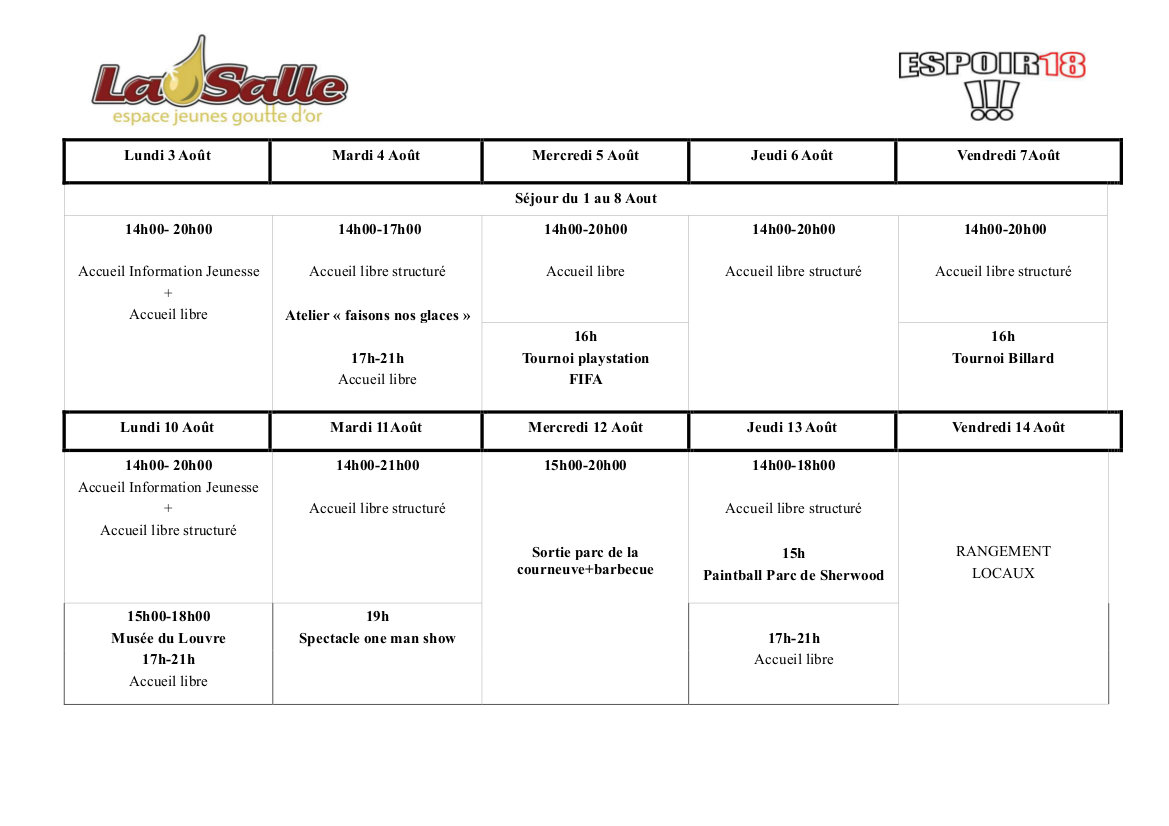 Planning été 2015 Espace Jeunes La Salle