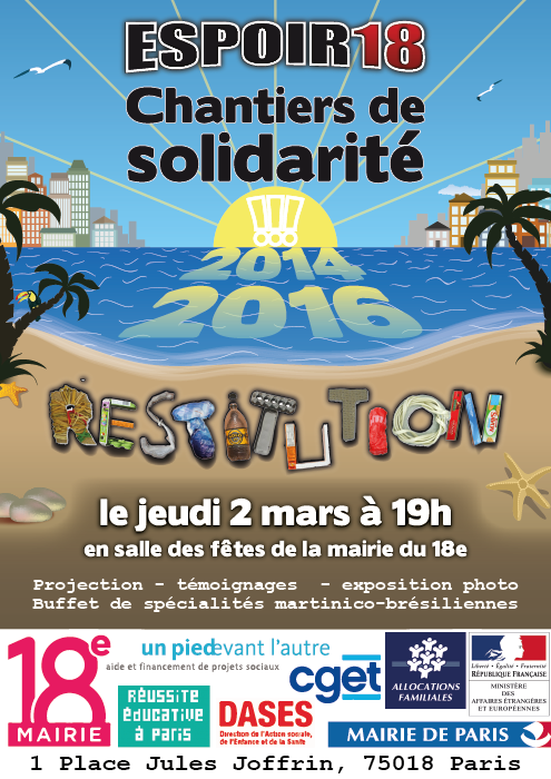 ESPOIR 18 vous convie à une restitution des Chantiers de Solidarité 2014-2016 à la Mairie du 18eme, le Jeudi 2 mars à 19h.