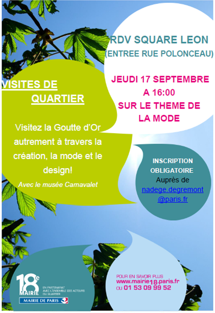 Dans le cadre des rendez-vous en plein air, une dernière visite aura lieu sur la thématique de la mode à la Goutte d’Or englobant les domaines de la création et du design. L’objectif de la visite est de découvrir les ateliers de création et de couture dans le quartier.